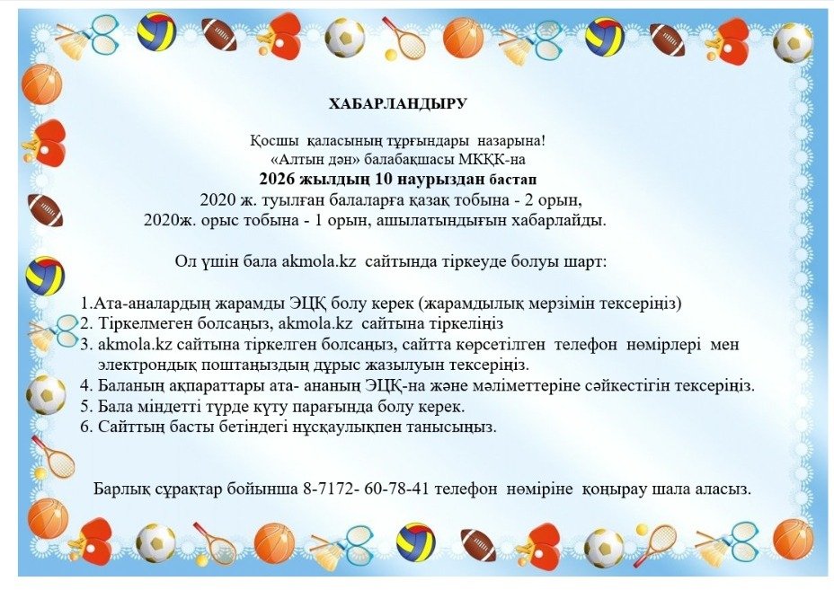 Қосшы қаласының «Алтын дән» МҚКК балабақшасы 2026 жылдың 1 наурыздан - 31 наурыз аралығында ресми интернет-ресурста 2025 жылғы Мемлекеттік қызмет көрсету мәселелері жөніндегі қызметі туралы есебін жария талқылау өткізілетінін хабарлайды.